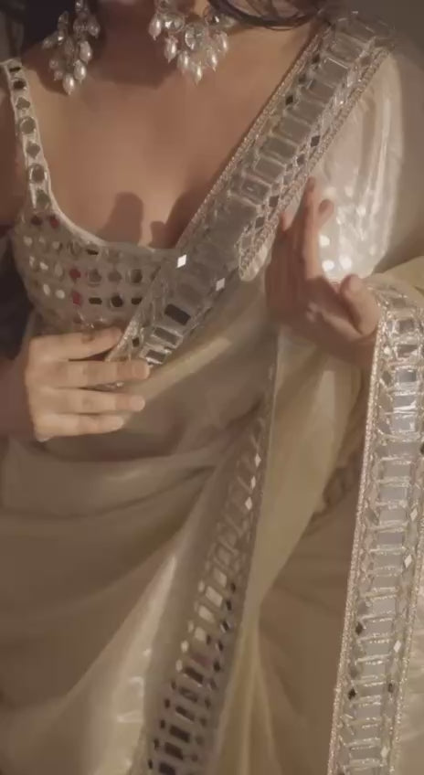 The smooth satin silk blouse is beautifully designed with matching embroidery and original mirror work, allowing you to tailor it perfectly to your fit and style. With its rich fabric, elegant drape, and refined craftsmanship, this saree is an ideal choice for weddings, parties, festive celebrations, receptions, and special occasions.